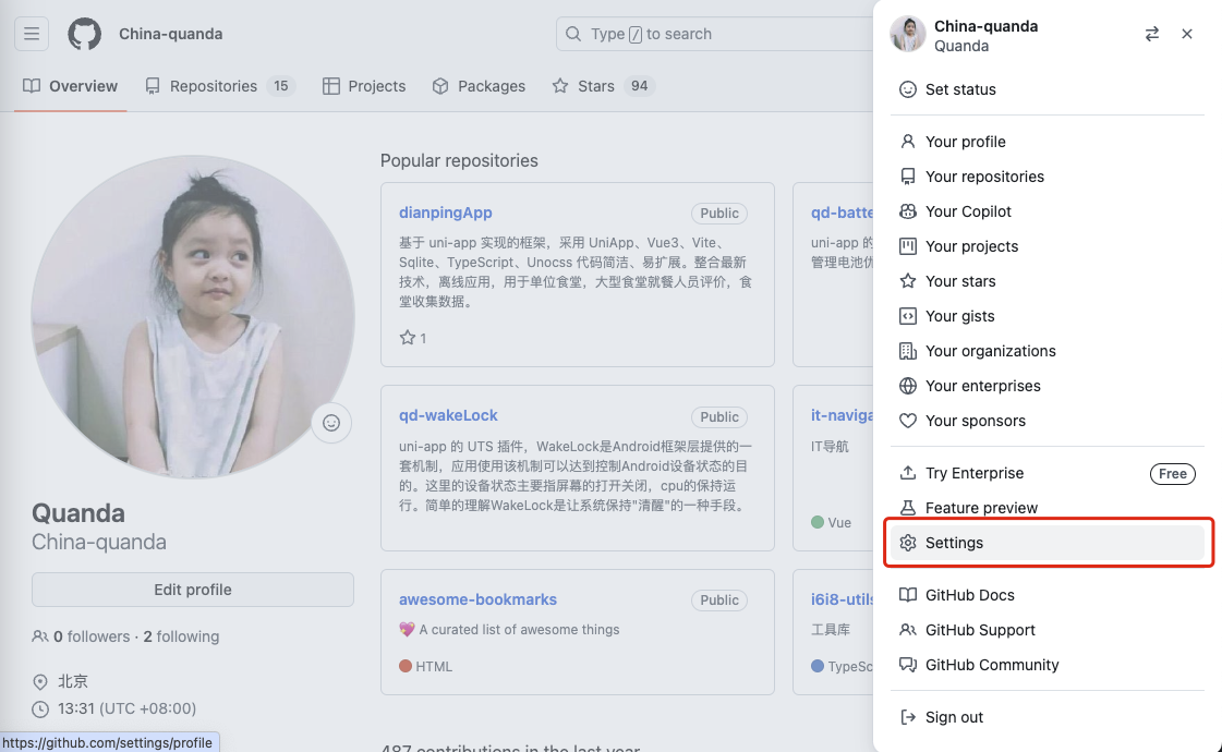 1.首先登录你的GitHub然后点击右上角的头像->点击进入Settings页面