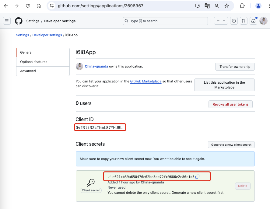 - 首先,在github上注册一个应用,并配置好回调地址,获取