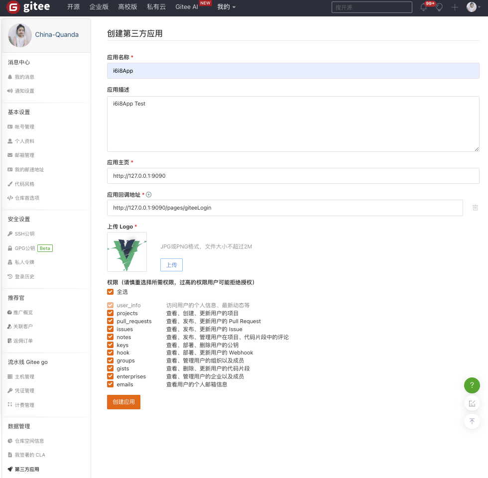勾选应用所需要的权限。其中: 回调地址是用户授权后,码云回调到应用,并且回传授权码的地址。