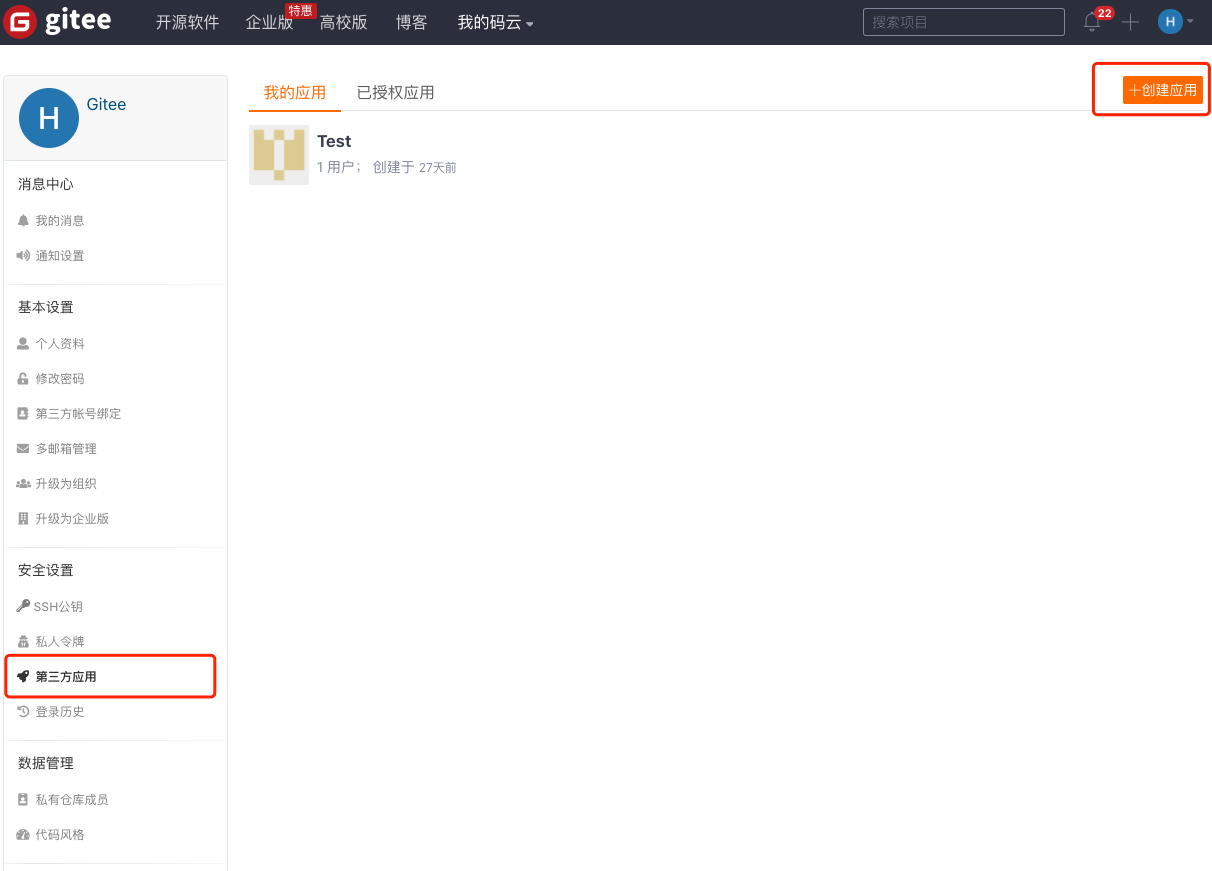 1.在 修改资料 -> 第三方应用,创建要接入码云的应用。